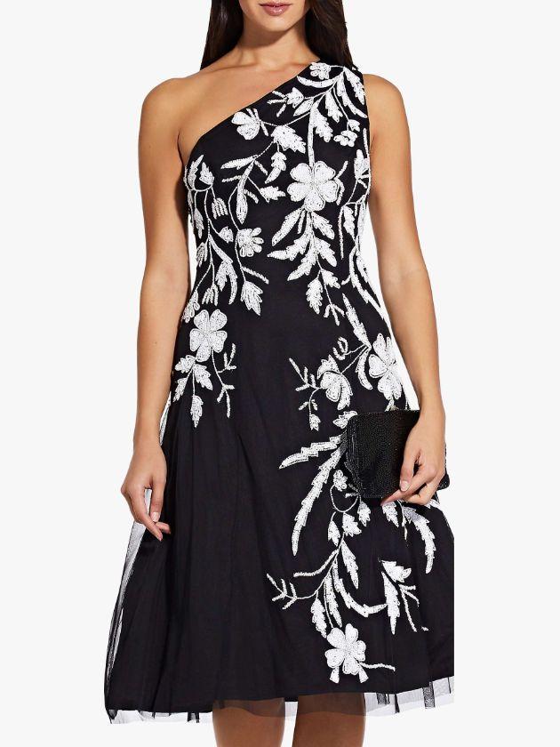 The design spreads from the one-shoulder across the body to the waist, and then along one side of the skirt, emphasising the asymmetric design of the dress.